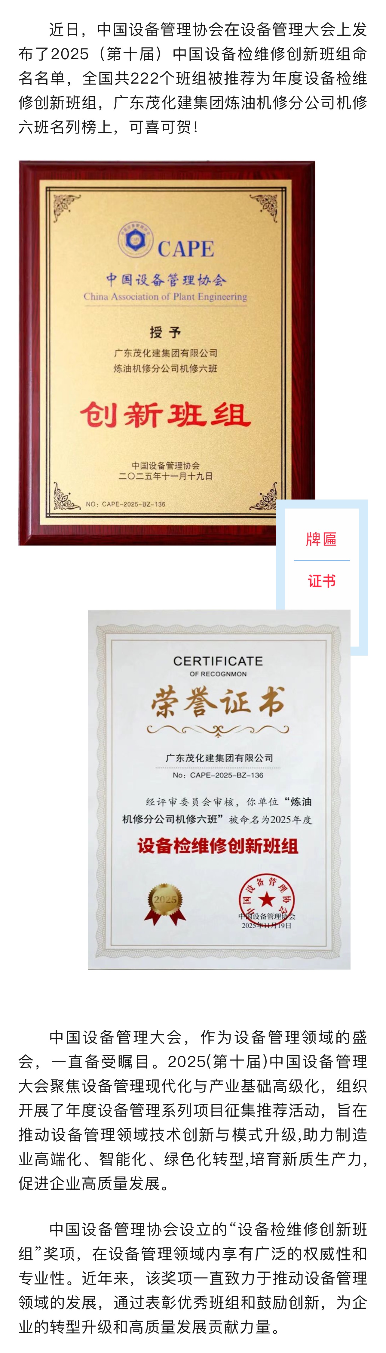 喜報 | 煉油機修六班榮獲全國”設備檢維修創新班組“稱號